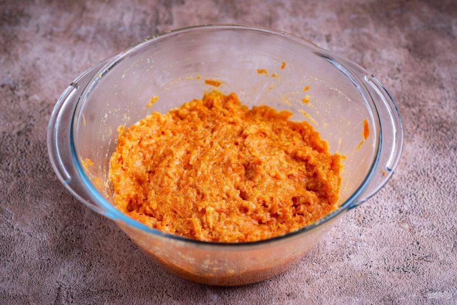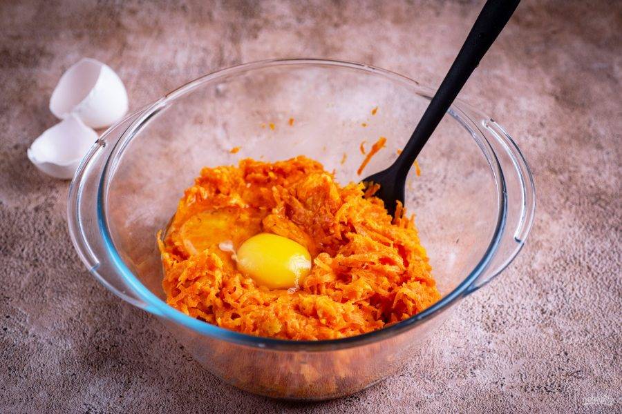 Затем выложите морковную массу в просторную миску для удобства и подождите, пока немного остынет. Вбейте яйцо.