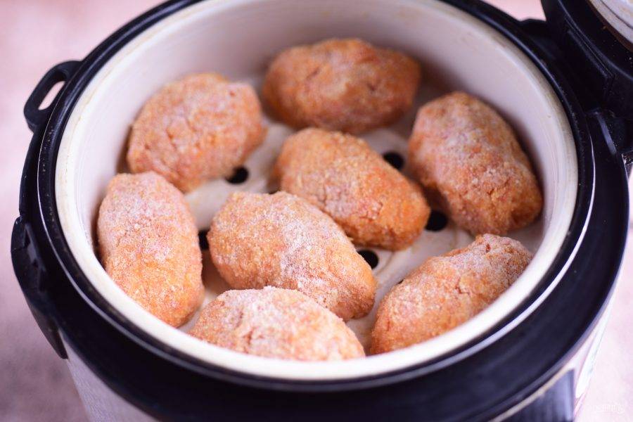 Выкладывайте заготовки морковных котлет в корзину для варки на пару, установите в мультиварку. Готовьте котлеты в режиме «На пару», 30 минут.