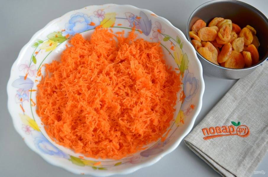 2. Очищенную морковь натрите на мелкой терке. Курагу залейте кипятком на 5 минут, после слейте воду.
