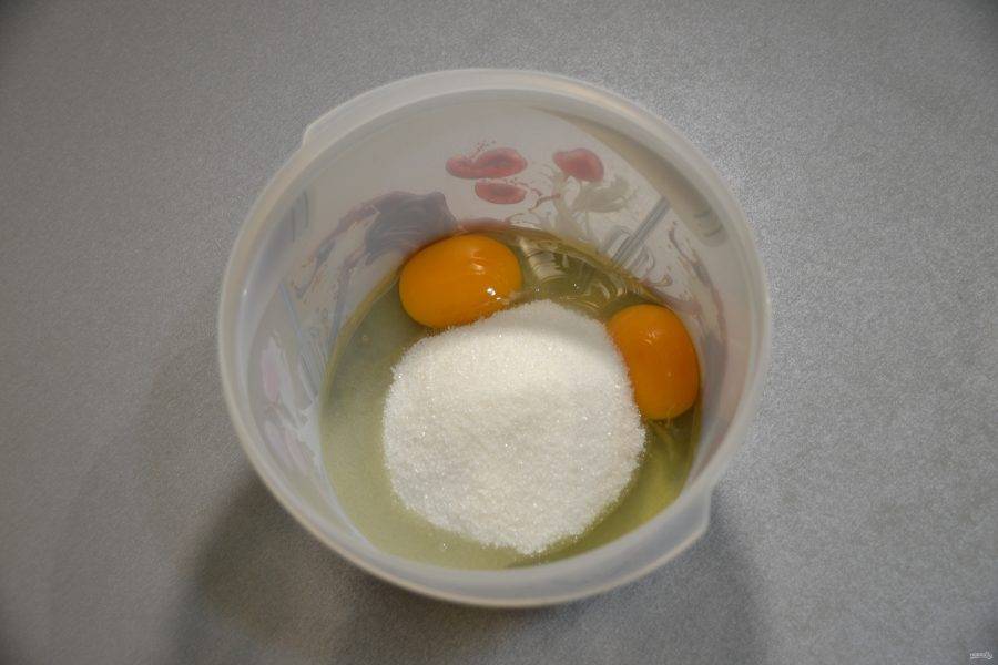 Вбейте 2 яйца в емкость для взбивания и всыпьте 120 г сахарного песка.
