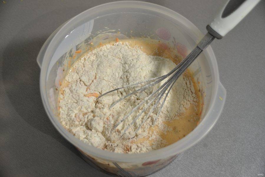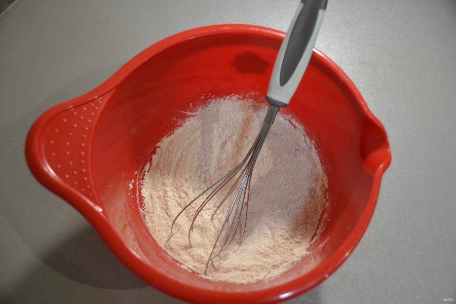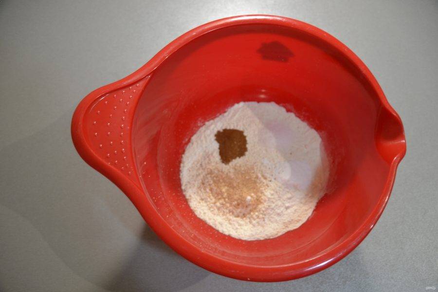 Всыпьте в миску муку, соль, половину пакетика ванильного сахара, разрыхлитель для теста, корицу и мускатный орех.