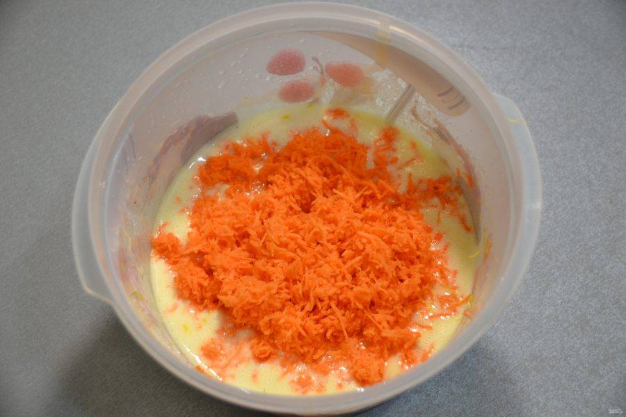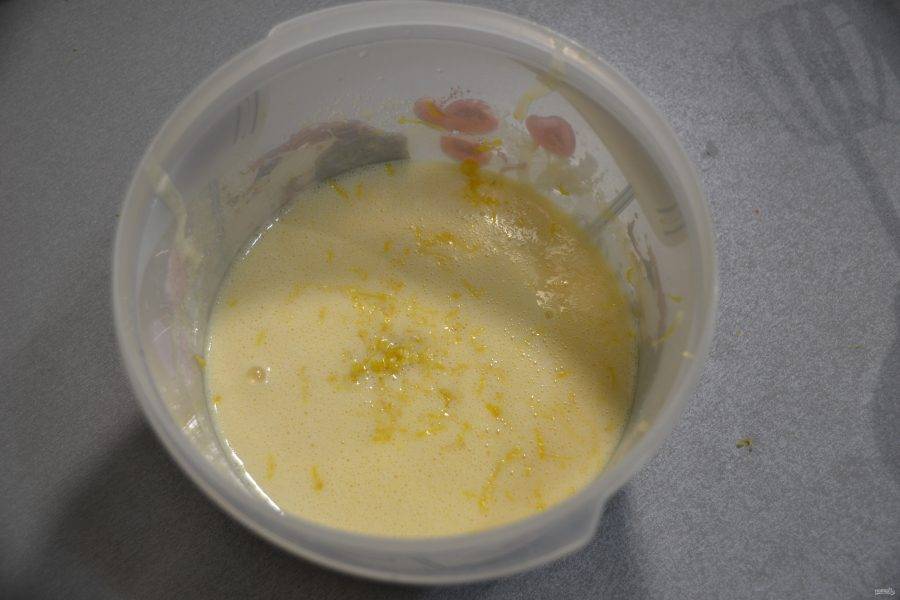 Взбейте яйца с сахарным песком добела, постепенно струйкой влейте растительное масло, продолжая взбивать. Затем добавьте столовую ложку лимонного сока и цедру 1 лимона.