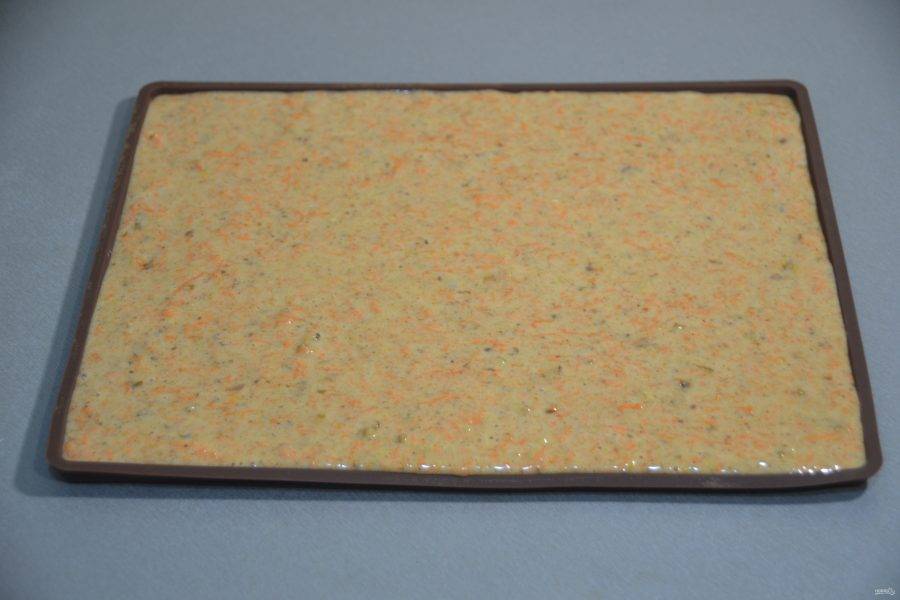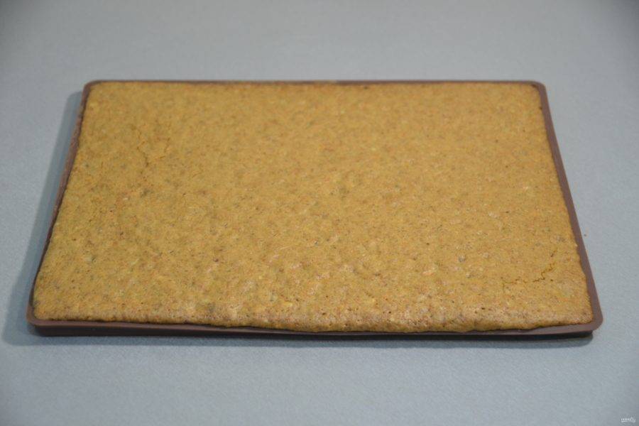 Вылейте тесто в форму для запекания, у меня силиконовый коврик с бортиками, размером 29х24 см. Выпекайте бисквит в духовке, разогретой до 180 градусов, 30-35 минут.