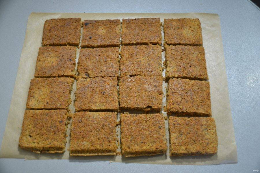 Охладите корж до комнатной температуры и нарежьте на ровные кусочки, их должно быть четное количество.