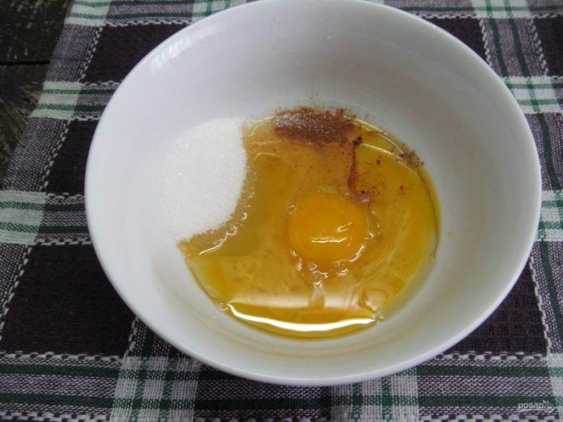 В другой глубокой тарелке смешать растительное масло, яйца, корицу и сахар. Перемешать венчиком, до получения однородной массы.