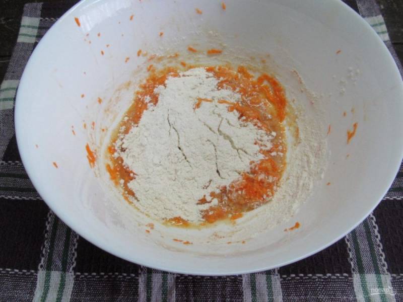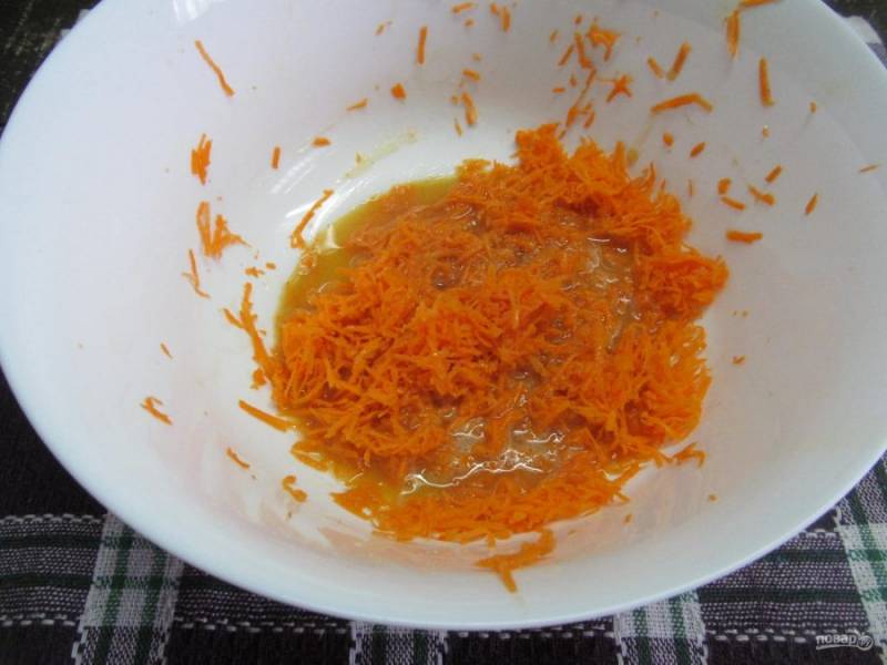К моркови добавить сладкую смесь растительного масла и яиц и тщательно перемешать.