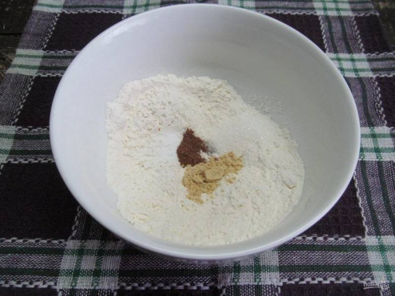 Для начала, нужно смешать ингредиенты - муку, соль, сухой имбирь, мускатный орех, разрыхлитель теста и ванильный сахар.