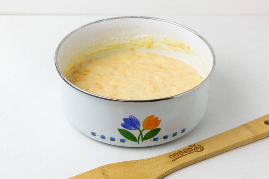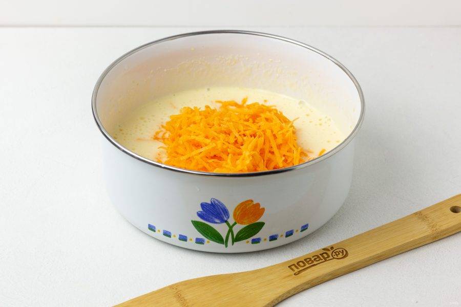 Морковь натрите на мелкой терке, добавьте в массу и перемешайте.