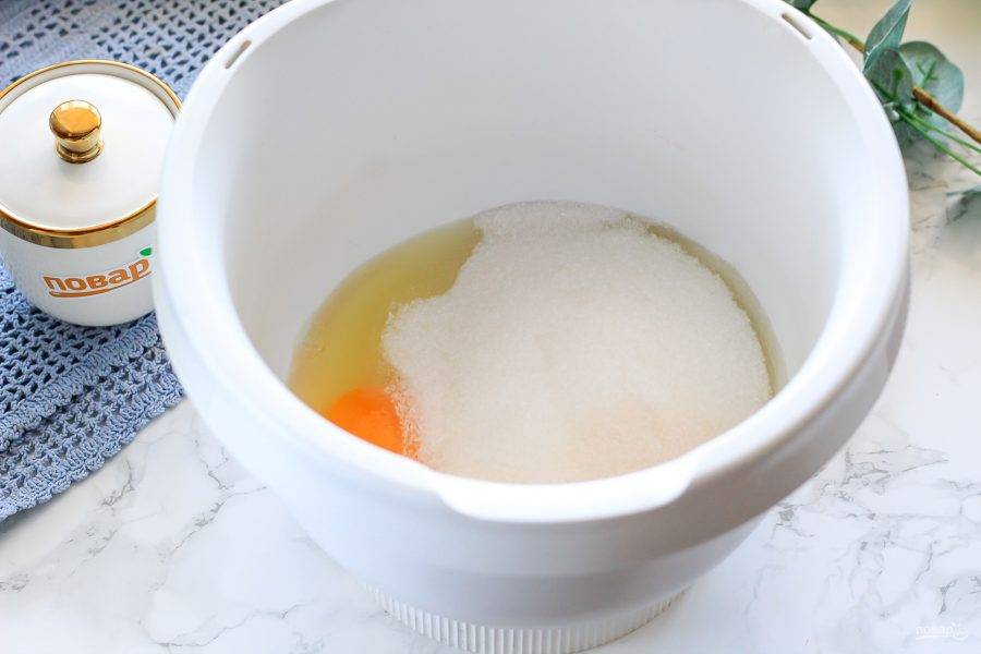 Куриные яйца вбейте в чашу миксера или кухонного комбайна и всыпьте туда же сахарный песок. Взбейте на высоких оборотах примерно 3-4 минуты в пышную пену.