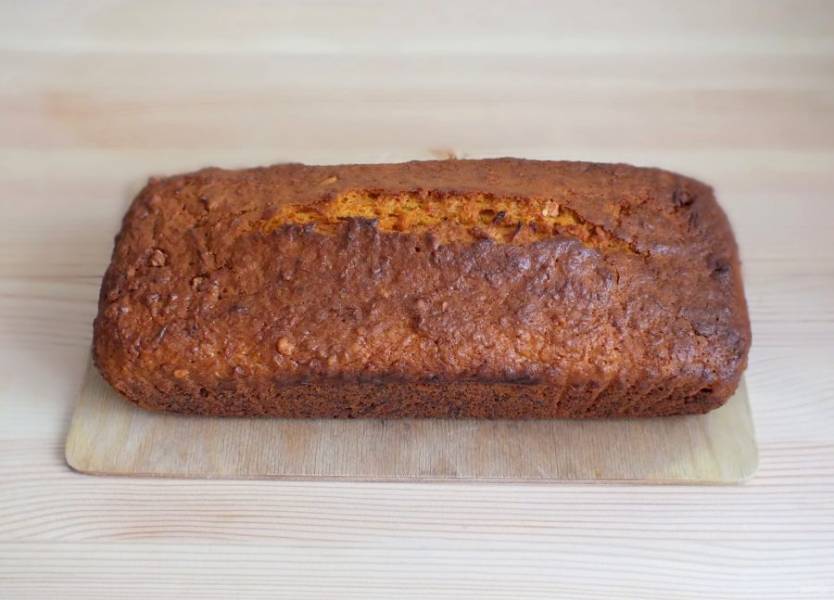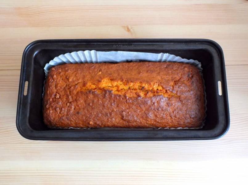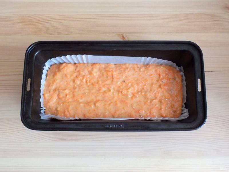 Включите духовку на 180 градусов. Возьмите форму для кекса, застелите ее бумагой или смажьте маслом. Вылейте в форму тесто. Разровняйте лопаткой. Поставьте на 40-45 минут в разогретую духовку.
