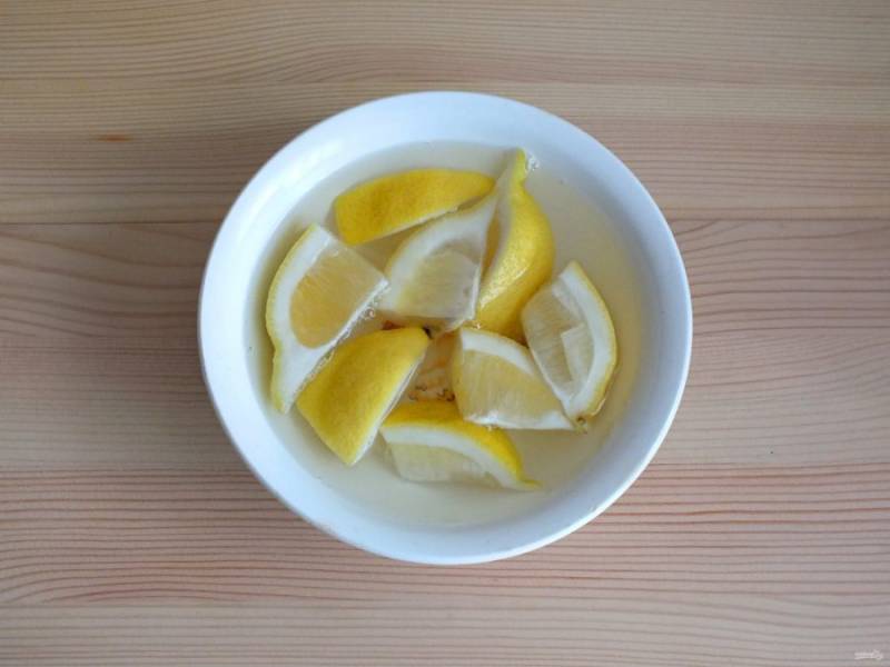 Приготовьте пропитку. Половинку лимона разрежьте на кусочки. Залейте кипятком и оставьте на 15 минут, для того чтобы вышла горечь.