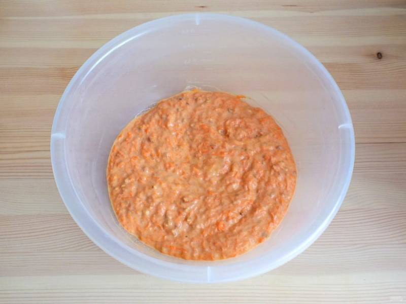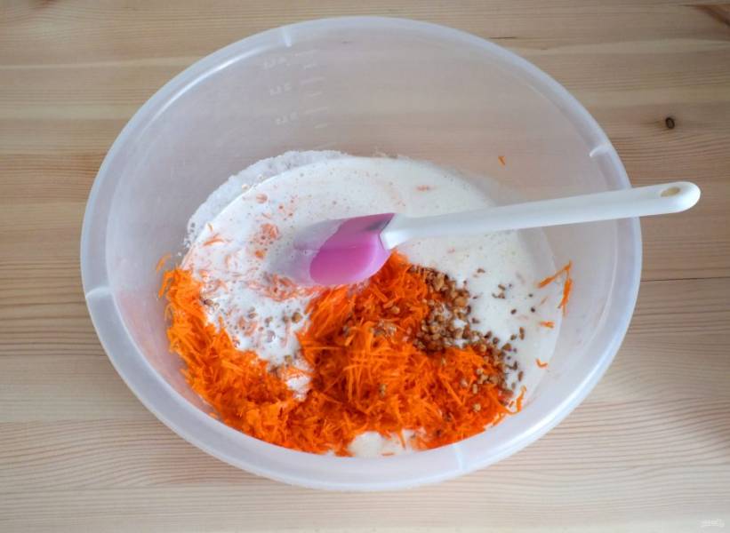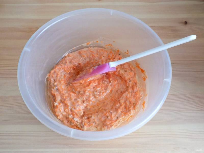 Добавьте в яичную массу тертую морковь и орехи. Перемешайте с помощью лопатки.