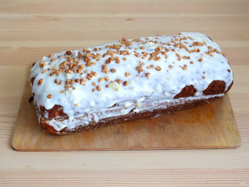 Обильно пропитайте обе части. Соедините, верх тоже полейте пропиткой. Посыпьте орехами. Оставьте при комнатной температуре на 2 часа.