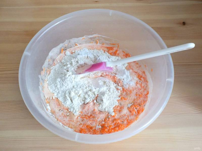 Введите просеянные муку и разрыхлитель. Размешайте с помощью лопатки.