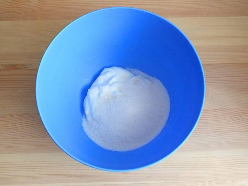 В чашу переложите сметану, добавьте сахар. Взбейте миксером до растворения сахара.