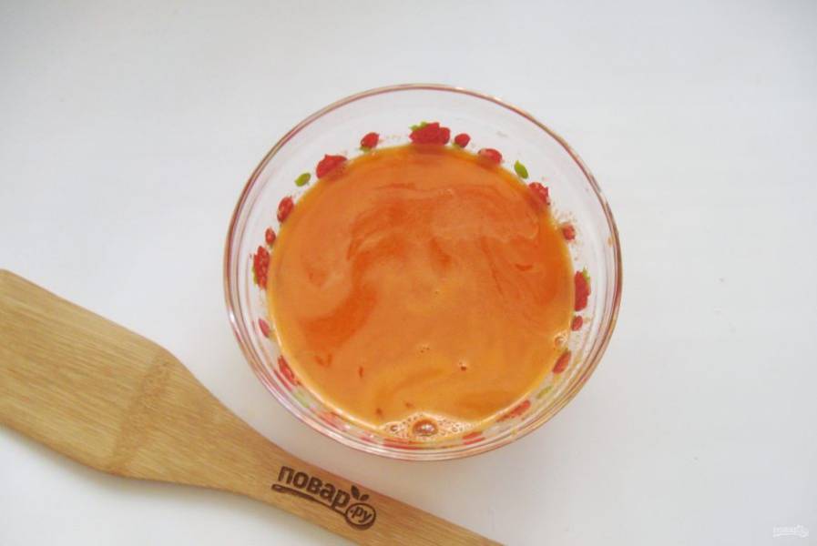 Влейте апельсиновый сок в морковный, добавьте холодную кипяченую воду и перемешайте.