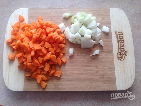 1. Очистим лук и морковь, нарежем. Качество нарезки нам не важно, ведь суп будет пюрироваться.