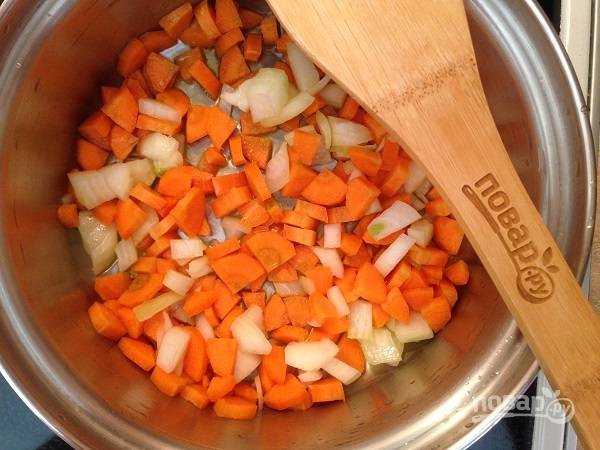 2. Обжариваем лук с морковью на оливковом масле до мягкости.