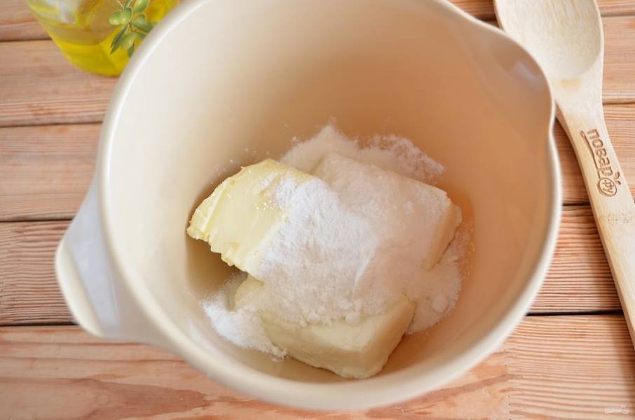 Для крема смешайте сливочное мягкое масло, творог и сахарную пудру (0,5 стакана сахара нужно измельчить в пудру или взять готовую).