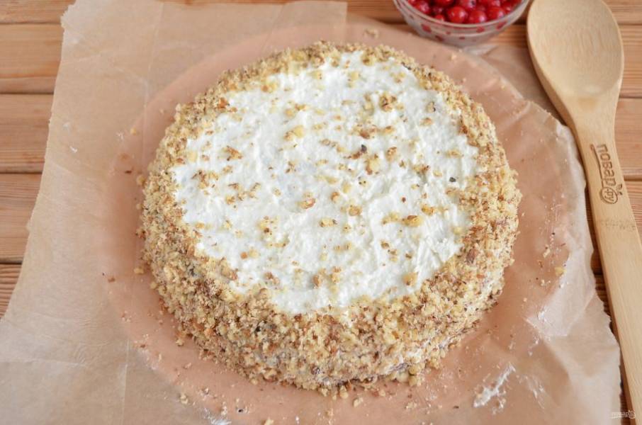 Накройте второй половинкой коржа, смажьте верх и бока кремом. Бока тортика и кайму обсыпьте орехами или тертым шоколадом, как нравится.