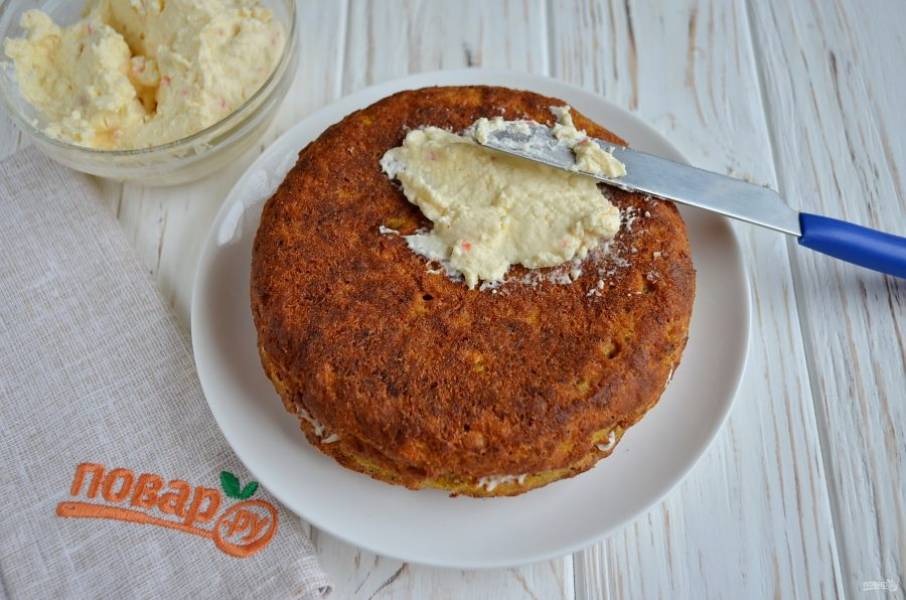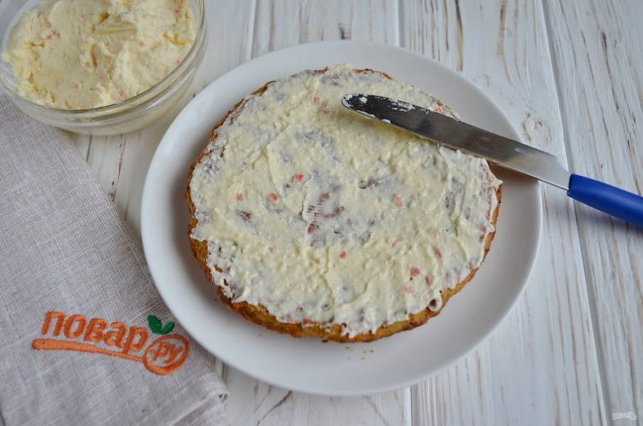 Первый остывший корж смажьте сливочным сыром.