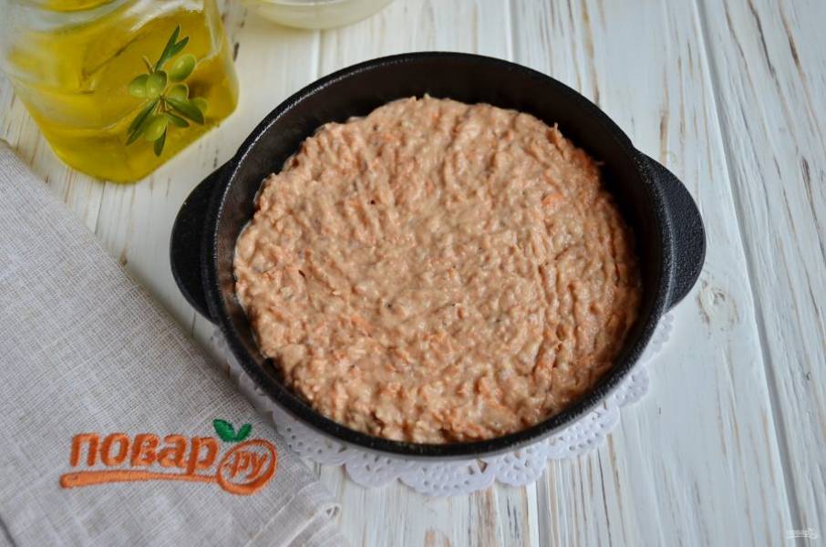 Разделите тесто на две части. Смажьте формочки для выпечки растительным маслом и разровняйте тесто. Выпекайте коржи при 230 градусах 20 минут.
