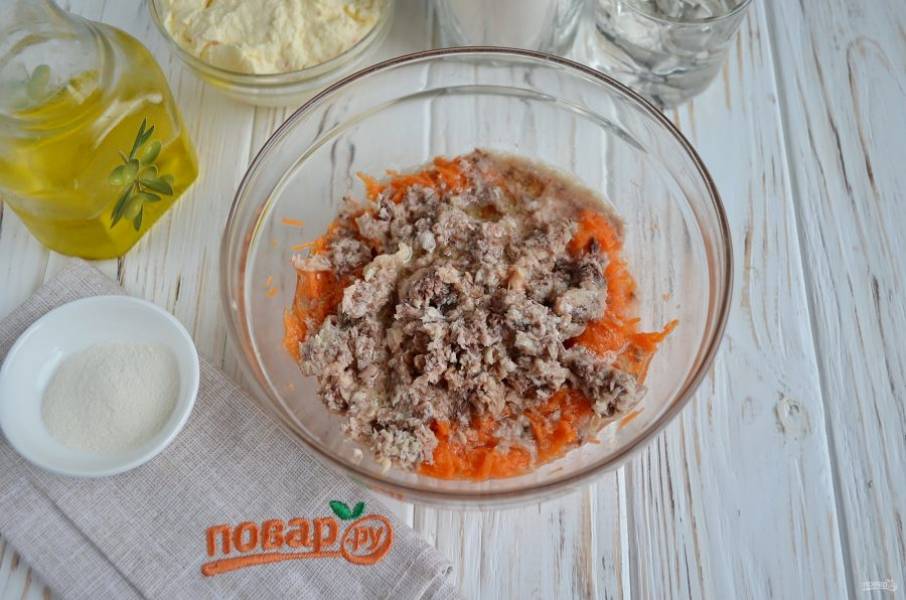 Консерву разомните вилочкой, добавьте ее к моркови. Перемешайте.
