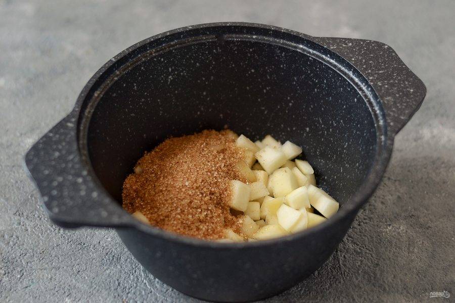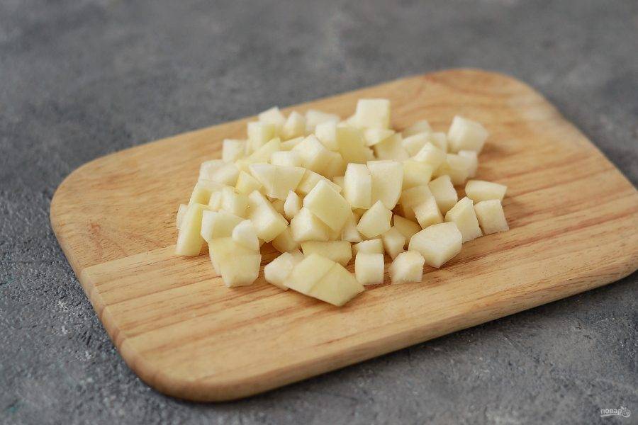 Для начала необходимо приготовить груши. Помойте их, очистите от кожуры и семечек, нарежьте на мелкие кубики.