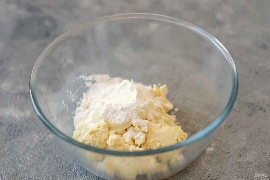 Для крема взбейте творожный сыр с сахарной пудрой на средней скорости.
