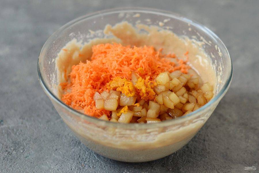 Добавьте грушу, морковь и апельсиновую цедру в тесто, перемешайте.