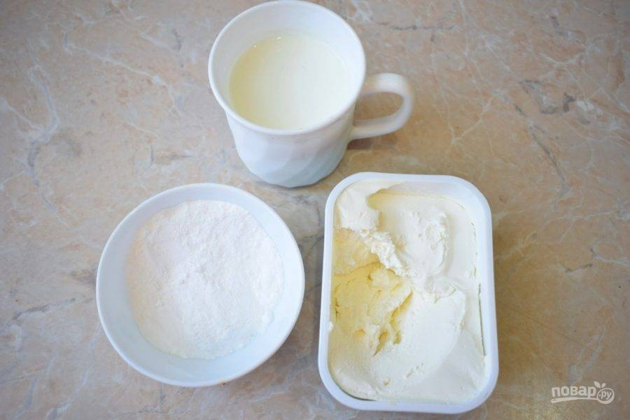 Для приготовления крема подготовьте сахарную пудру, охлажденные сливки и творожный сыр комнатной температуры.