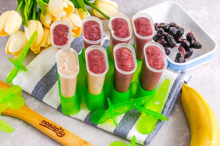Измельчите банановую нарезку в пюре примерно за 2-3 минуты и половину ее разлейте в подготовленные формочки для мороженого. Можно некоторые формы наполнить полностью, а некоторые до середины, оставляя место для пюре из шелковицы.