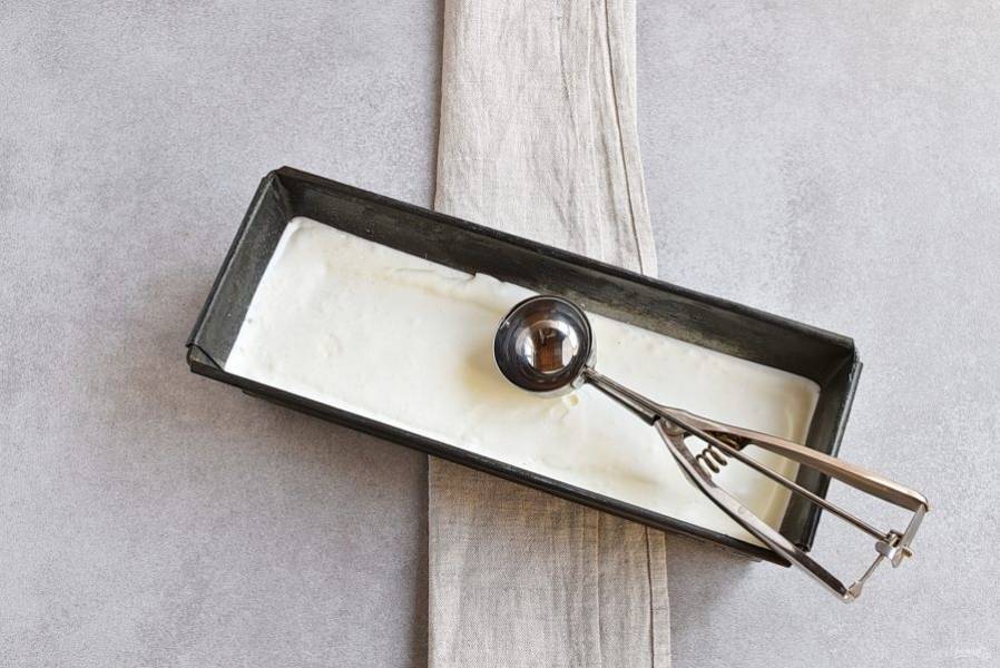 Перелейте сливочную массу в любую удобную для помещения в морозилку форму. Я предпочитаю замораживать в металлической форме, мне кажется, так мороженое застывает быстрее.