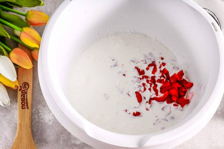 Охлажденные сливки жирностью не менее 30% перелейте в чашу кухонного комбайна или миксера. Замороженную вишню без косточек нарежьте мелкими кубиками, не размораживая ее. Добавьте в емкость вместе с сахарным песком.