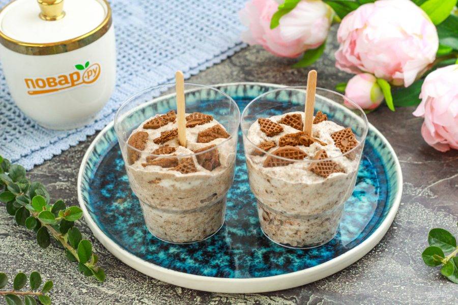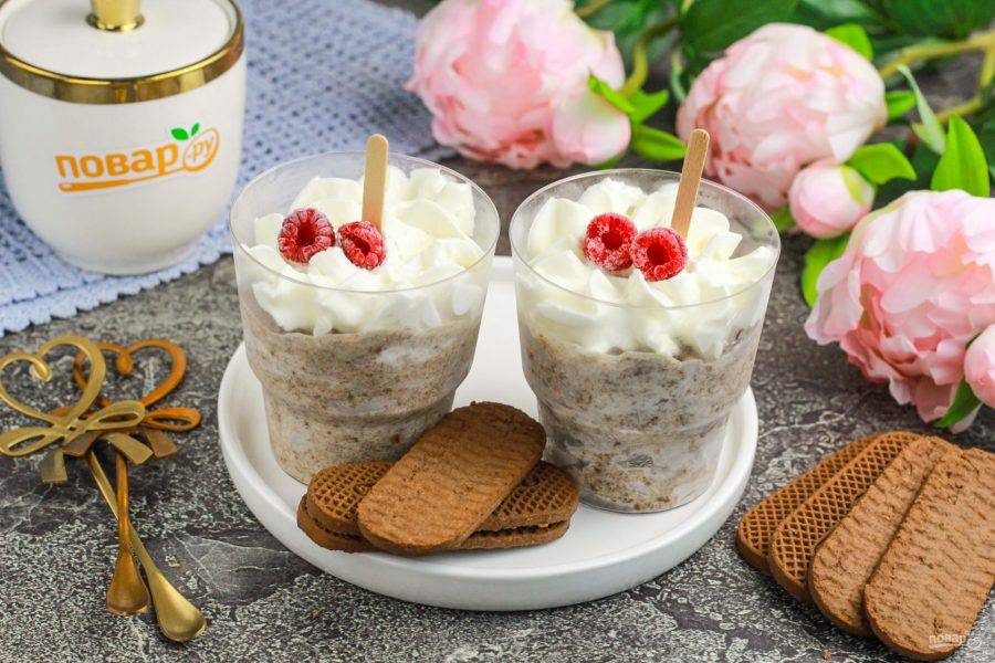 Спустя указанное время десерт полностью застынет. Украсьте его при подаче взбитыми сливками, ягодами, печеньем и т.д. Приятного вам аппетита!