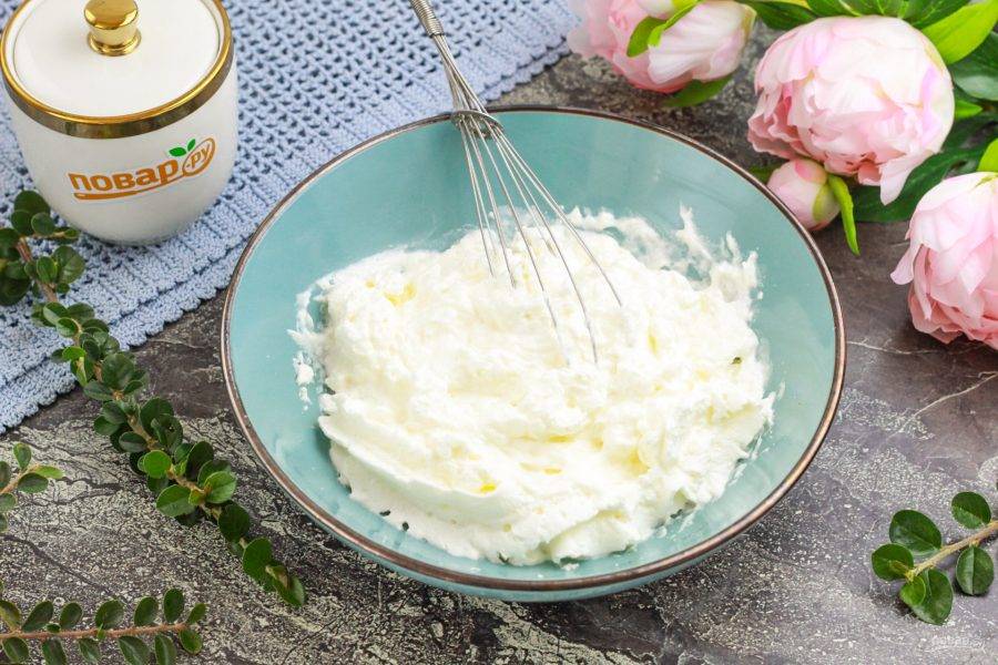 Сливки выложите в чашу миксера или кухонного комбайна, всыпьте туда же сахарную пудру и взбейте в течение 2-3 минут в крем. По желанию можно добавить какой-нибудь ароматизатор.