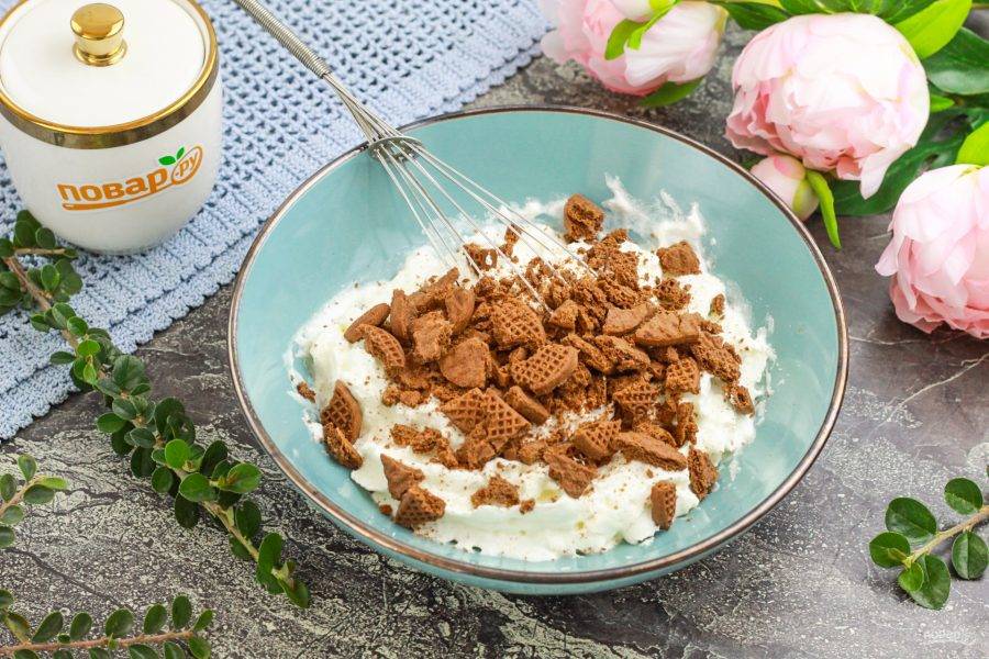 Ракрошите в сливочный крем шоколадное печенье, оставляя небольшие кусочки. Оставьте немного печенья для украшения десерта. Все тщательно перемешайте.