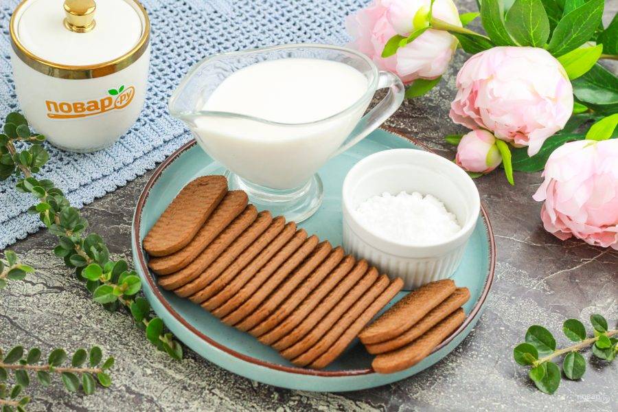 Подготовьте указанные продукты. Сливки используйте высокой жирности, не менее 33%, а печенье приобретите песочное: ванильное или шоколадное.