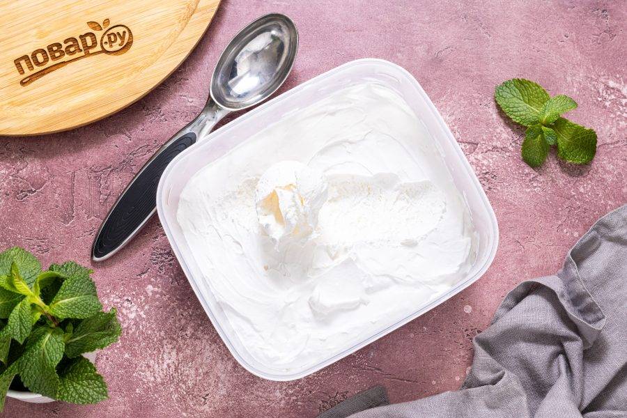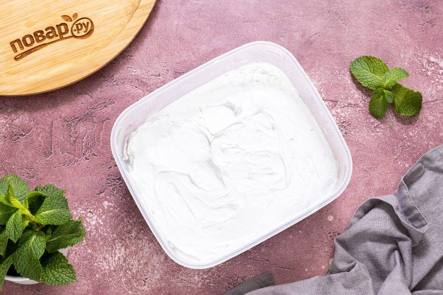 Переложите смесь в пищевой контейнер, разровняйте ложкой, закройте крышкой. Уберите в морозилку на 6 часов.