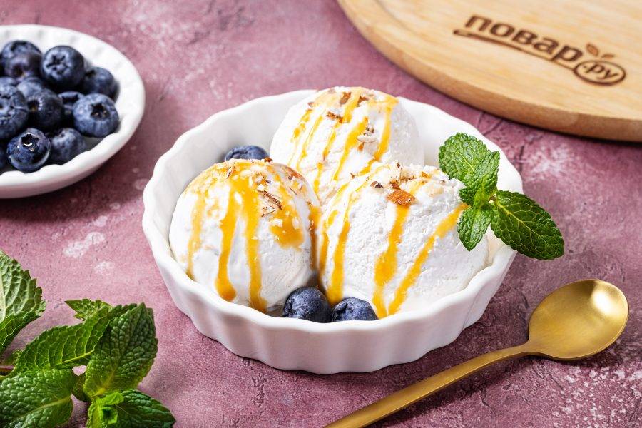 Перед подачей можно разложить мороженое порционно, полить карамелью, добавить ягоды и мелко порубленные орехи. Приятного вам аппетита!