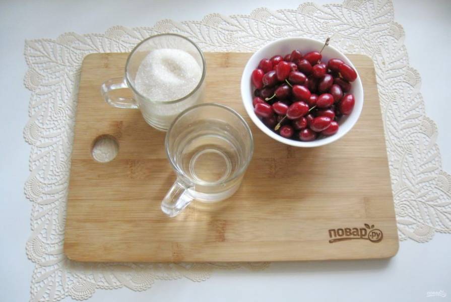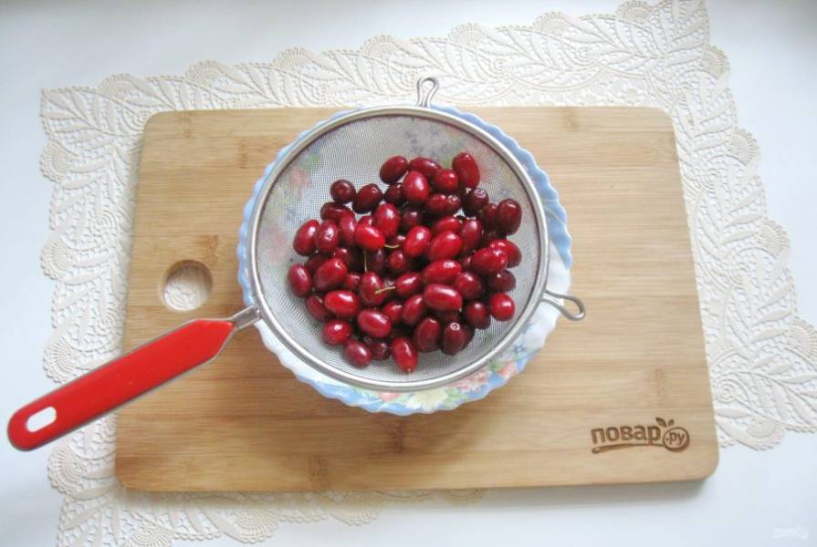Кизил помойте, залейте кипятком и дайте постоять 5-6 минут. После выложите в сито.