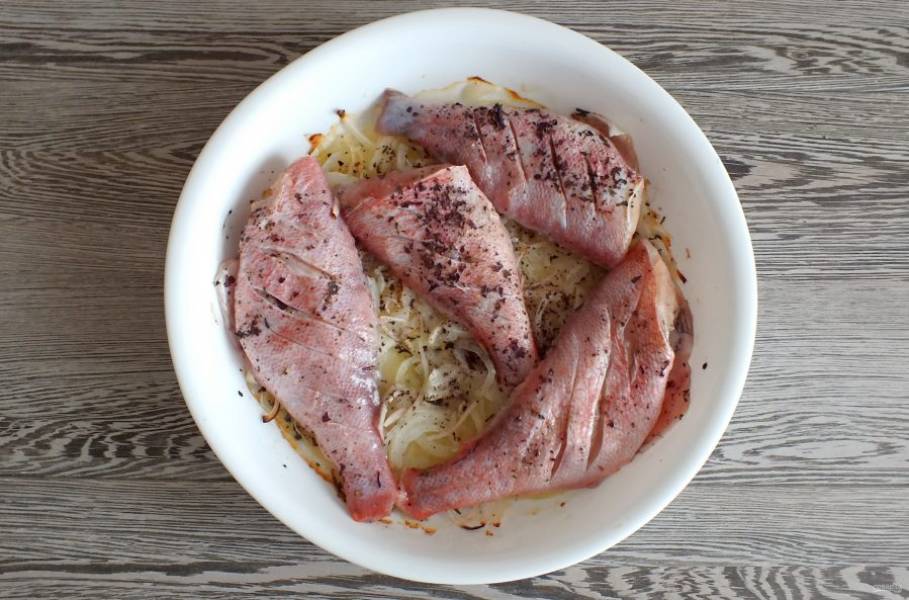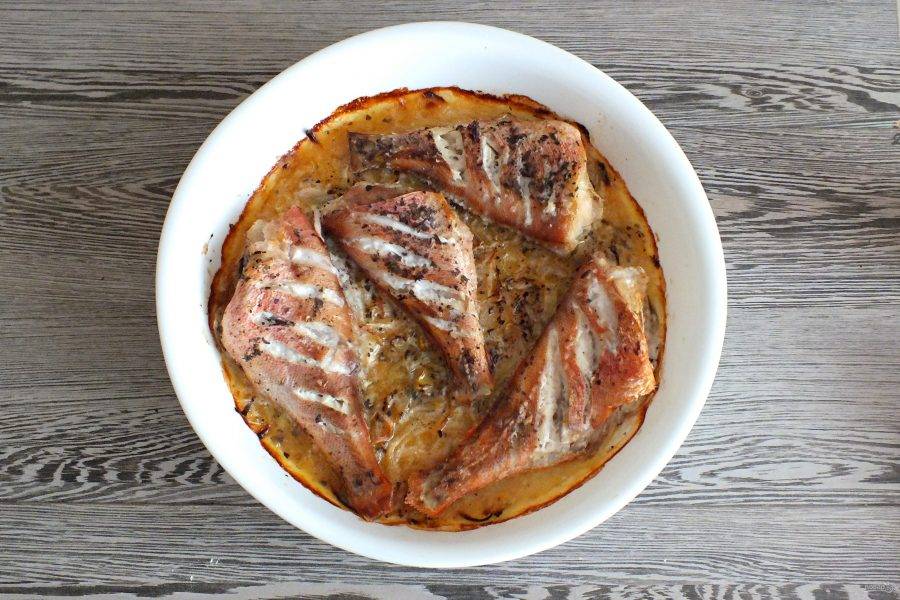 На луковую подушку выложите подготовленную рыбу. Верните форму в духовку и запекайте рыбу 20-25 минут. Учитывайте особенности своей духовки.
