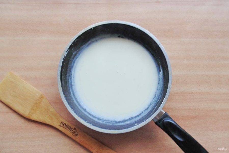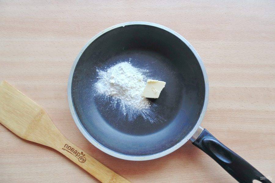Приготовьте молочный соус. В сковороду выложите кусочек сливочного масла и муку. Растопите масло и хорошо перемешайте с мукой. Комочков не должно быть.