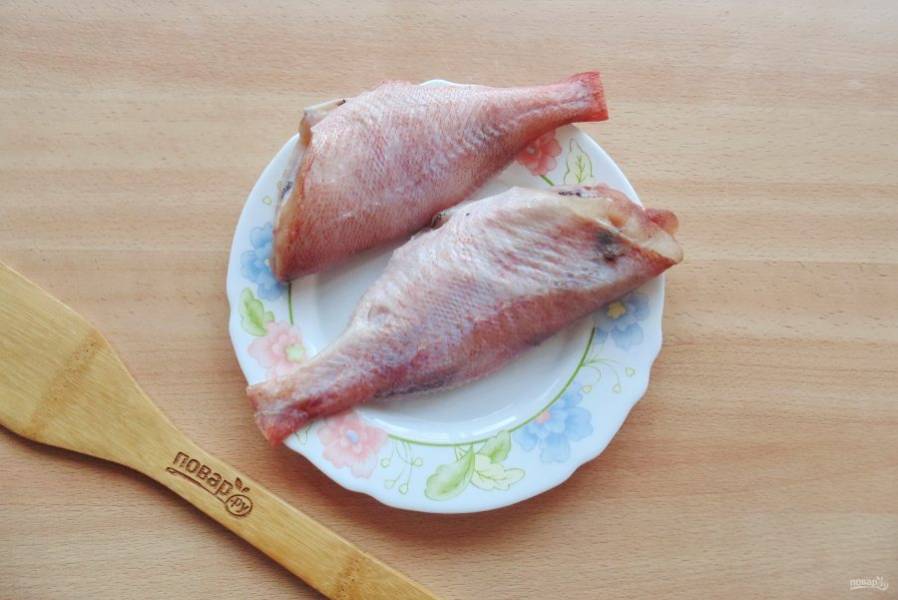 Морской окунь очистите, выпотрошите, удалите черную пленку в брюшке. Обрежьте плавники и хорошо помойте внутри и снаружи.