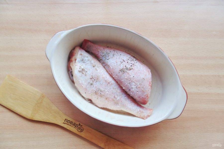 Окунь выложите в форму для запекания, смазанную сливочным маслом. Посолите и поперчите рыбу.