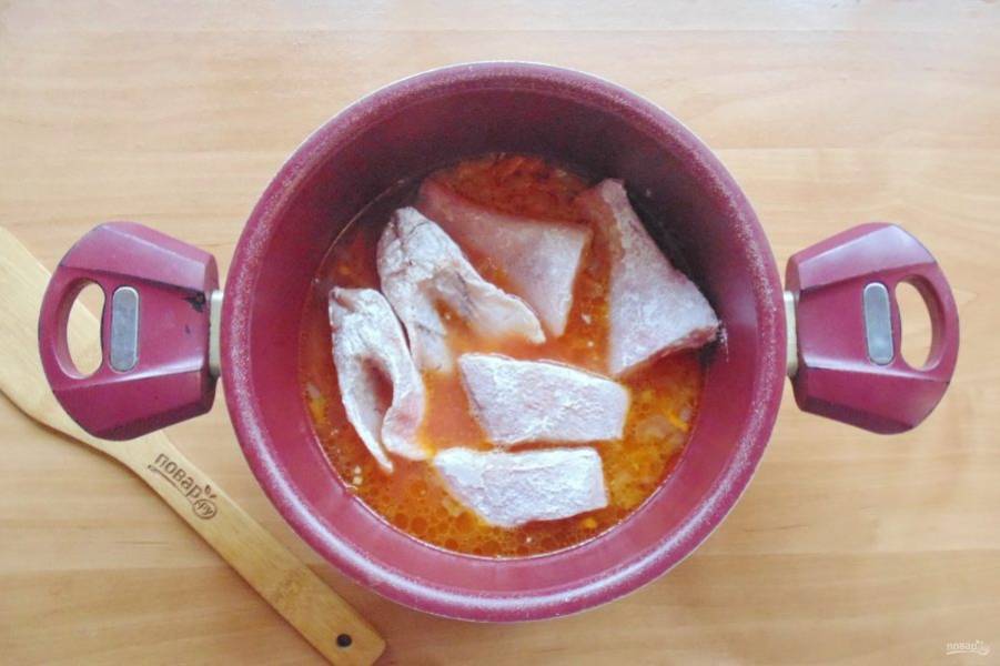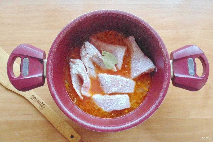 Накройте кастрюлю крышкой и тушите морского окуня на небольшом огне 15-20 минут до готовности.