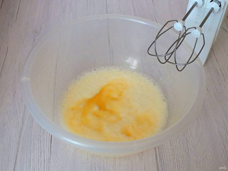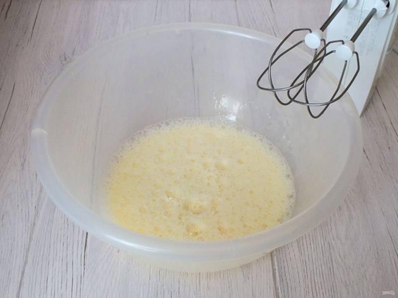Разбейте яйца в глубокую чашу. Взбейте на максимальной скорости до пышности. Добавьте молоко, перемешайте.