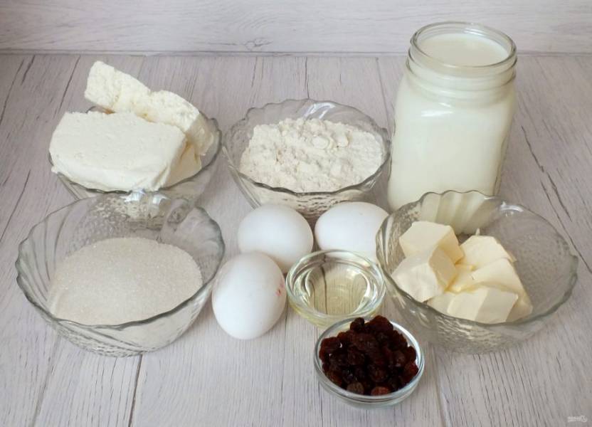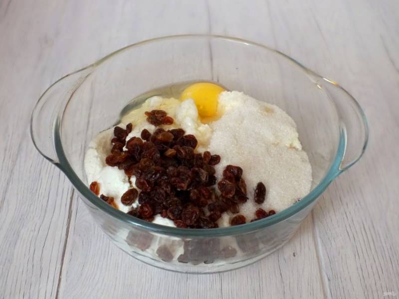 В отдельной чаше смешайте творог, 4 ст.л. сахара, 1 яйцо и изюм (предварительно слив воду и обсушив бумажной салфеткой).