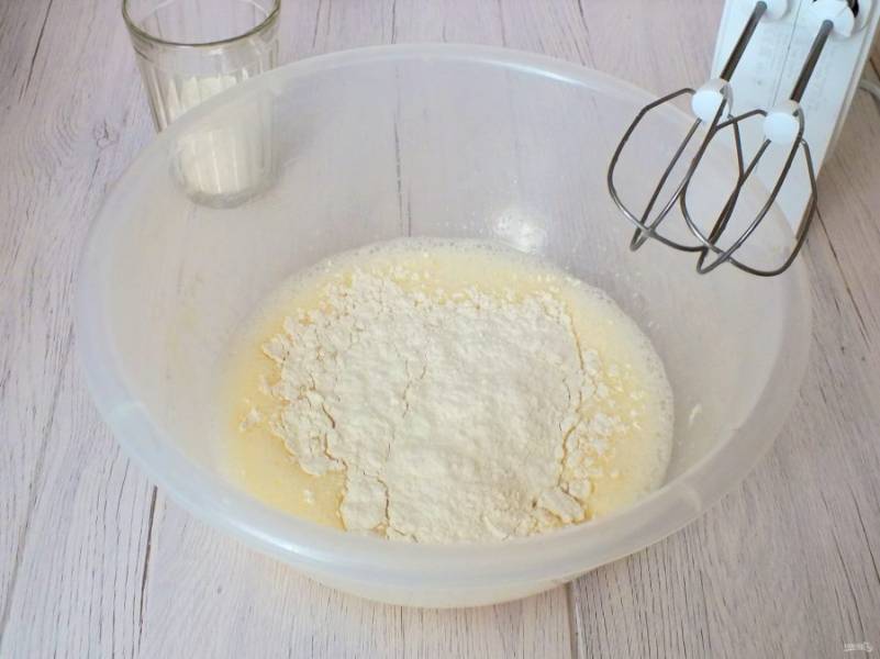 Количество муки разделите визуально на три части. Добавляйте частями муку в яичную массу и взбивайте после каждого раза.