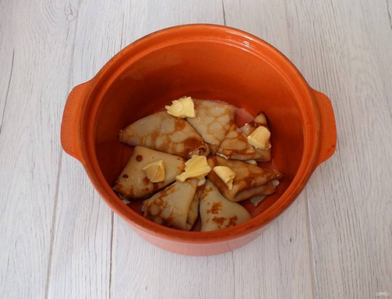 Выложите оставшиеся блинчики на каждый слой распределяя сливочное масло. Закройте крышкой и поставьте на 30 минут в разогретую духовку.